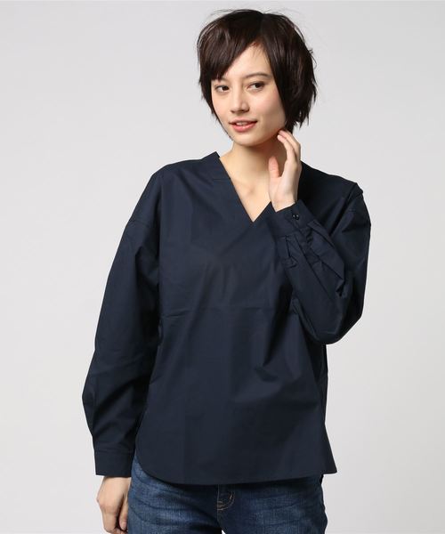 雑誌【Domani 6月号】掲載 雑誌【MORE 4月号】掲載 スキッパーデザインが、女性らしいフェミニティを薫らせるブラウス。バックは深めのVネックで、こなれ感をプラスする好ディテール◎ クリーンなルックスで着回し力も高く、大人レディなスタイリングに大活躍の着回し万能シャツです。