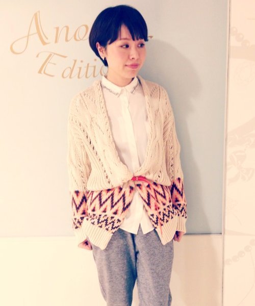 ジャカード柄ケーブルカーディガン☆ 袖口、裾のジャカード柄が目を惹くカーディガンは長めの着丈とざっくりとしたケーブル編みがキュートな1枚。 ヒップが隠れる着丈のカーディガンはワンピーススタイルにさらりと羽織ったり、細身のパンツに合わせたりと様々なコーディネートで活躍してくれます。 ジャカード柄も春らしく明るいカラーを取り入れたのもポイントです。 model:H168 B80 W58 H84 着用サイズ:フリー ※スタッフ着用画像は色味が若干異なります。カラーは詳細画像をご確認ください。 ※着用、お取り扱いの際は商品についておりますアテンションタグ、洗濯ネームを必ずご確認ください。 店舗にお問い合わせの際は、全国のAnother Edition店舗まで 下記の品名/品番をお申し付け下さい。 品名:AE JQ CABLE COL CCGN 品番:56151990791