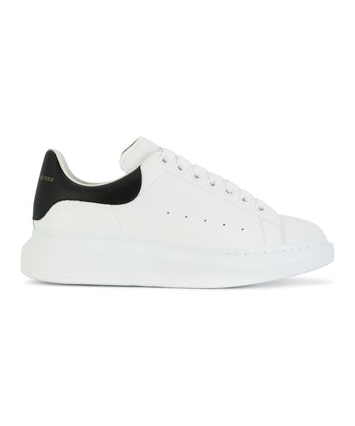 Alexander McQueen(アレキサンダー・マックイーン)の、フラットソール スニーカー(ホワイト)。ラウンドトゥ、紐で結ぶタイプ、シューズのタンにロゴ、コントラストの効いたヒールカウンター。