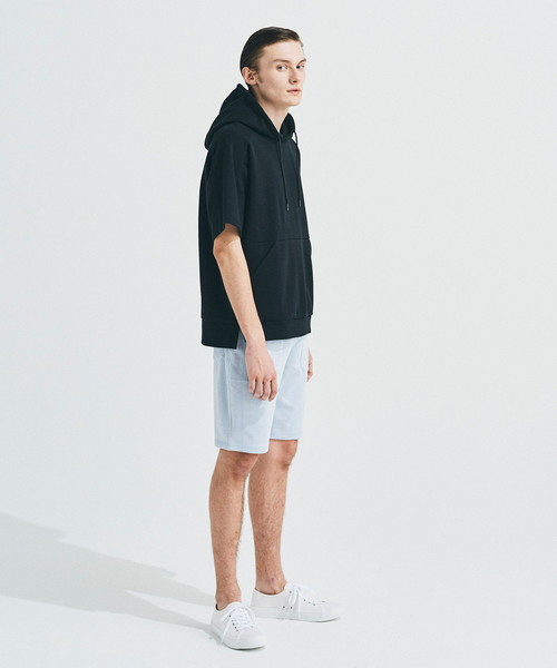 BIGシルエットが特徴の半袖プルパーカ☆ 程よく厚みがあり、柔らかい触り心地のダンボール素材を使用しているので着心地がよく、一枚で着られます。立体的で動きやすいシルエット設計が最大の特徴で、ゆったりと着ていただけます。