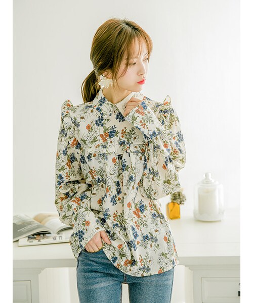 伸縮性ないポリエステル100% 仕上げで軽く柔らかいタッチ! ネックラインの安定で甘さまで 加わった花柄デザインです。 春らしいさわやかなフラワーパータンが魅力ポイント! 肩とバストのフリルははなやかに見せます。 フロントの自然なシャーリングが美しいシルエットをプラス。 全体的に可愛らしい印象に完成です。 テクスチャーもナチュラルに。