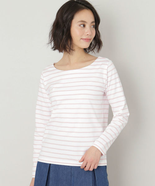 大人カジュアルなスタイリングにマストなボーダーカットソー。デコルテがきれいに見えるネックと、すっきり細身で仕上げたボディが女性らしく着こなせるポイントです。トップスをアウトにした時もさり気なくセンスを感じるサイドスリット入りで高評価。肌当たりの良いコットン素材を使用しているため着心地も申し分なしです。オン・オフ問わずデイリーに着回せる、活躍度の高い一枚です。