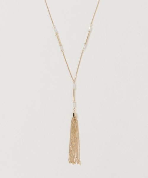 シンプルなシャツやワンピースのスタイリングにさっと合わせるだけで様になる、ロングネックレス。チェーンにフリンジトップを組み合わせたエレガントなデザインです。動きのあるフリンジトップがアクセント。