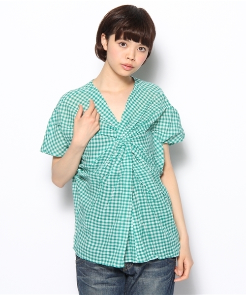胸元のねじったようなデザインが印象的なギンガム柄のブラウス。 カジュアルなギンガムをガーリーテイストに落とし込んだ、 レトロで可愛いブウラスです。 中国製品番:76156163020 model:H163 B78 W58 H84 着用サイズ:フリー