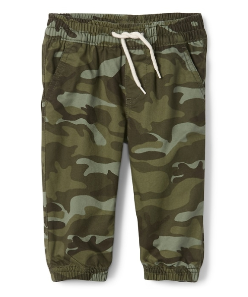 着脱が簡単なプルオンウエスト滑らかなポプリン素材の織地 ゴム仕様のウエストにドローコード付き フロントに斜めポケット、バックにパッチポケット エラスティック カフス カモフラージュ プリントの総柄 *商品タグに記載の価格とサイト上の販売価格が異なる事があります。