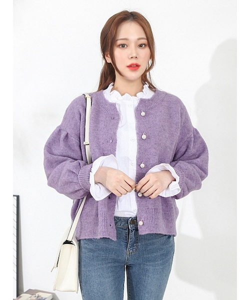 華やかなカラーが特徴で、パールボタンがポイントです。 ブラウスとコーディネートすると、愛らしく、スカートやパンツとともに、クラシックにコーディネートしても綺麗に見えます。❤