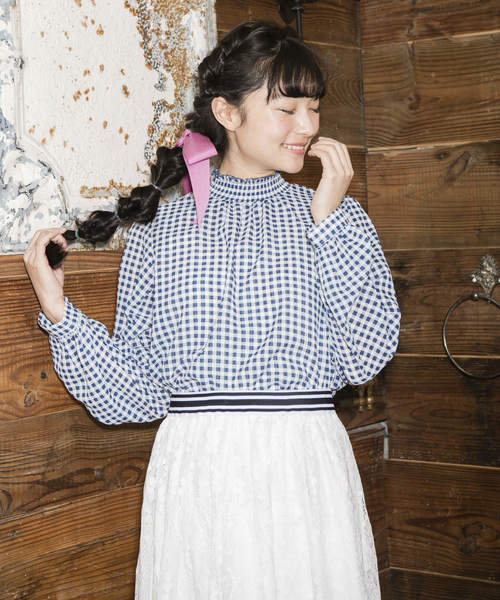 OLIVE des OLIVE 2018SSプチハイネックのデザインが個性的なブラウス。全体にギンガムチェック柄を配してカジュアルな雰囲気に仕上げました。バックはさりげない肌見せで女の子らしいポイントに。ボトムのデザインを選ばず着回せる1着です♪