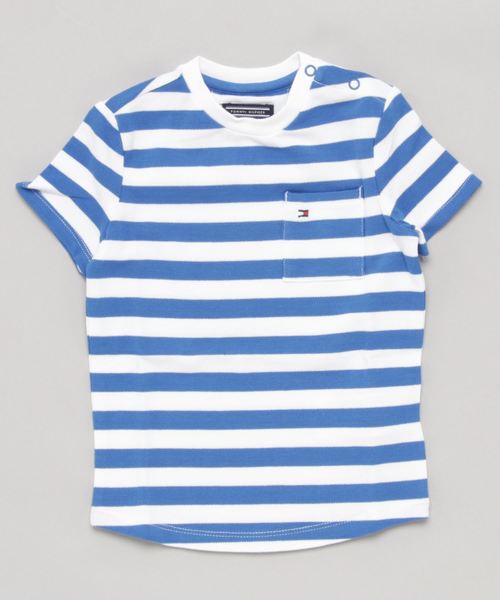 シンプルなボーダーを落とし込んだ、爽やかなテイストのクルーネックTシャツ。 さらりとした肌触りの生地を使用し、快適な着心地を叶えました。 左胸にはフラッグロゴ入りのポケットをレイアウトしています。 デニムやチノパンツとの相性もよく、春夏のボーイズスタイルをアップデートできる一枚です。