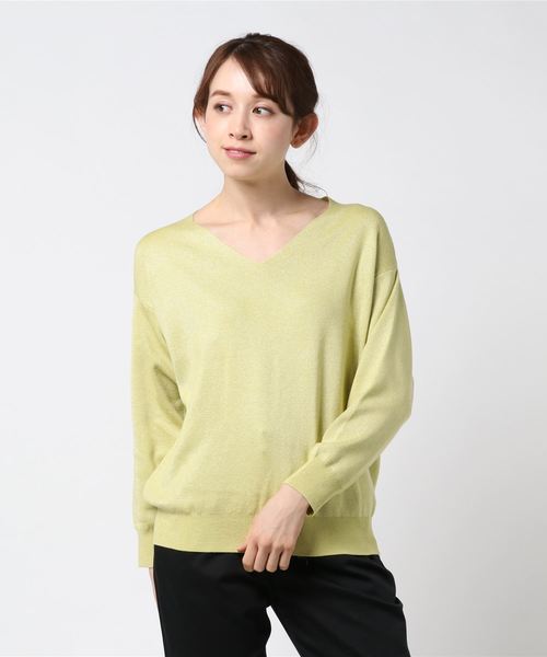 国産の細番手の糸を使用し、ラメ特有のチクチク感がなく心地よく着ていただけるニットに仕上げました。 ゆったりとしたコクーンシルエットがストレスフリーの着心地です。 バックにスリットを入れてアクセントを付けました。 ラメが光を集めてお顔映りのいいアイテムです♪ こちらは同素材で「ラメ2WAYリブカーディガン(RD18A0050120100)」もございます☆