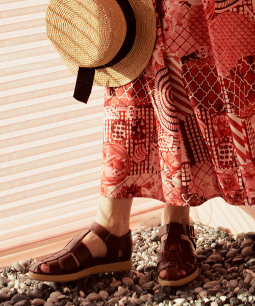2018-SS NOSTALGIA キービジュアル着用商品 露出が少な目なのでラフ過ぎず、でも暑苦しくないグルカサンダル。 すっきりとした細めのラインで、きれいめスタイルや大人カジュアルにもぴったり。 パンプスやスリッポンは暑いけど、サンダルほどラフにしたくない時におすすめです。 バックストラップはベルトで長さ調節もでき、着脱も動きもスナップボタンタイプ。 ふんわりクッションの中敷きが履き心地の良いサンダルです。 ※長さは、やや大きめです。 ・普段24cmのスタッフがLサイズ試着:【かかとが少し余るが、ストラップを短くすればちょうど良い】 ・普段24.5cm甲高幅広のスタッフがLサイズ試着:【つま先が少し余るが、ストラップを短くすればちょうど良い、幅はぴったり】 ・普段25cmのスタッフがLサイズ試着:【長さはぴったり、ストラップがきついので最長にすればちょうど良い】