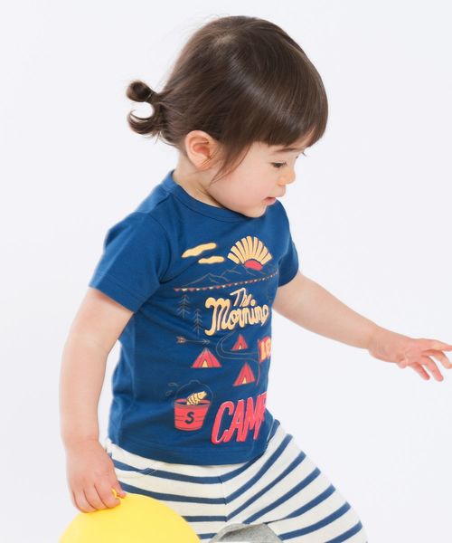キャンプや山登りをイメージしたプリントTEEシャツです。 グレーは透明プリントを使用し、艶を出しました。 ブルーは版をわざとずらしてプリントに立体感を持たせました。 ※80,90cmサイズのみ肩釦つき。
