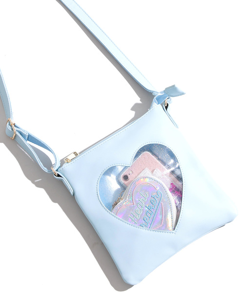 フェイクレザーで仕上げたショルダーバッグ。小ぶりなシルエットが、持っているだけでスタイルを可愛く見せてくれます。シースルーのハート柄には、お気に入りの写真や小物を入れられる遊び心あるひと品。普段のスタイリングに取り入れるだけで、手軽に着こなしのアクセントになります。遊び心溢れるカラーリングの7色展開でご用意しました。お値段も手頃ですので、ご自身用は勿論、プレゼントにもオススメです。
