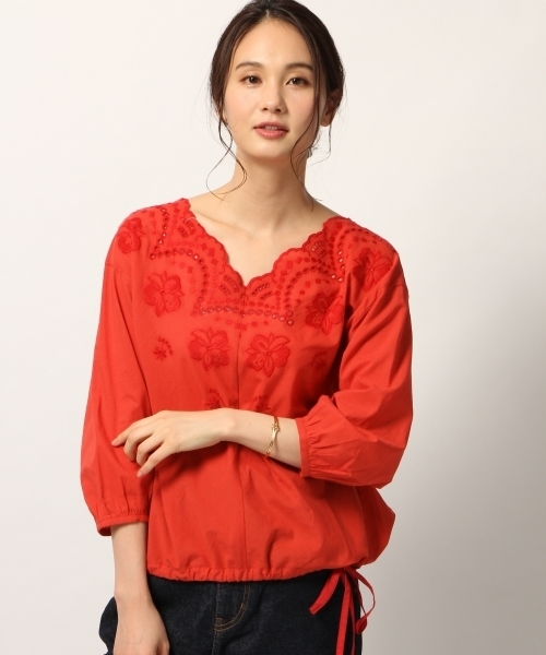 女性らしいスカラップ刺繍 生地と刺繍糸を配色にし、柄のバランスにもこだわりました。 裾のドローストリングでふんわりとバランスが変えられるので、どんなボトムにも着用できます。 合わせなボトムはシンプルでも刺繍ブラウスで一枚で女性らしく♪ 綿100%が嬉しいブラウスは、自信をもってオススメしたい一枚です。