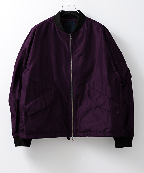 【STUDIOUS(ステュディオス)】キュプラ混の非常に珍しいタフタ素材を使用したブルゾン。2色の糸を交織にすることで、独特のシャンブレーカラーを表現しています。メモリー感がある素材で軽さと光沢感が特徴です。手洗い可能トレンドのビッグシルエットサイズに設定し、肩も落としています。裾には軽さを出す為に、リブではなく、スピンドルを通した仕様にしています。野暮ったいイメージのミリタリーMA1ブルゾンを今期らしくトレンドを盛り込んだデザインに仕上げています。