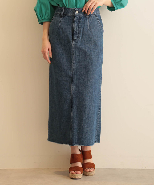 デニム素材を使用したハイウエストスカート。足長効果のあるハイウエストタイトのタイプですが、スリット入りで足さばきも軽快。定番ボトムとしてシーズンレスに使えるワードローブにプラスするのにもってこいの一枚です。 ・ジップフライ。