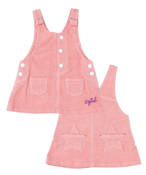 カラシ色と淡いピンクが新鮮なコーデュロイシリーズ。サロペットスカートはちょっぴりレトロなデザインが可愛いアイテム。SWEAT STADIUM JUMPERとKNIT CAPをかぶって元気アメカジスタイルの出来上がり!