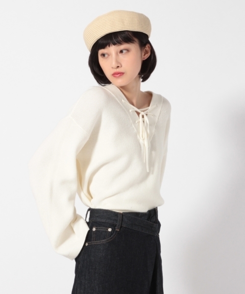 人気!!!レースアップニットに新作登場★ 大人気ニットが春仕様で入荷!! レースアップデザインのネックがかわいく、カラーも落ち着きのある色に春らしい鮮やかな色と豊富にご用意しております★ 袖は今季人気のワイドデザインとなった女性らしいアイテム。 そのままVネックで着ても、インナーにハイネックやタートルネックを合わせても可愛く着れる1枚です♪