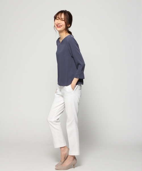シンプルなブラウスは綺麗なシルエットで差をつけたい! 薄手でキメの細かい綺麗めの素材を使用した春先にぴったりのブラウス。 シンプルなデザインの中にも首回りのカッティングがアクセントを加えています。 女性らしい綺麗なシルエットも魅力! ジャケットのインにも使えて使い勝手の良いブラウスです。