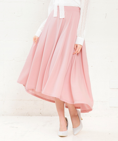 ふんわり広がるロング丈のフレアシルエに、前後差をつけたイレギュラーヘムのデザインが目を惹く。穿くだけでスッキリ見せてくれる上品スカート。ダスティパステルカラーで甘さ控えめな大人の着こなしに。【素材・サイズ感】シャリっとした手触りで伸縮性のあるカットジョーゼット素材を使用。柔らかくしわになりにくいから毎日穿きたくなっちゃう。【スタイリング】ボーダーTなどでカジュアル合わせもおすすめの1枚。風通しの良い素材感でロングシーズン着られそうなのも嬉しいポイント。・裏地有り。