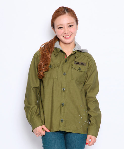 バックサテンを使用したミリタリーシャツ★ゆったりめのメンズライクなサイズ感と、ペイント加工がポイント!スウェットの取外しフード付き。第1ボタンを外すと、星の刺繍が覗くデザイン!!