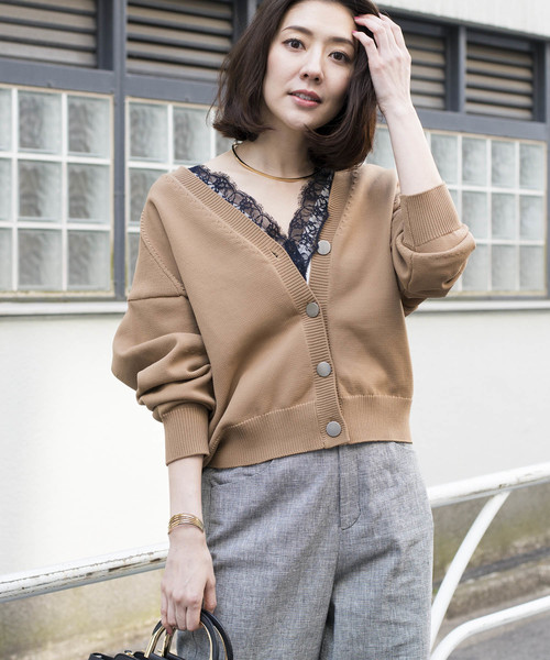 膨らみのあるポリエステル糸で作った、軽くて立体感のあるカーディガン。 編みのテクニックを駆使したボリューム袖と、後ろが少し長いバックテールシルエットに加え、網目を変化させたニットならではの変化を楽しんでいただける、オリジナリティ触れるアイテムです。 フロントのボタンをフラットなメタルボタンにし、すっきりさせることでプルオーバーのような着こなしがしやすくしました。 カラーはベーシックなホワイトとキャメルの他、今季注目のグリーンの3色展開。 着丈がコンパクトなので、ワイドパンツや揺れ感を楽しめるミモレ丈のスカートとのコーディネートもおすすめです☆