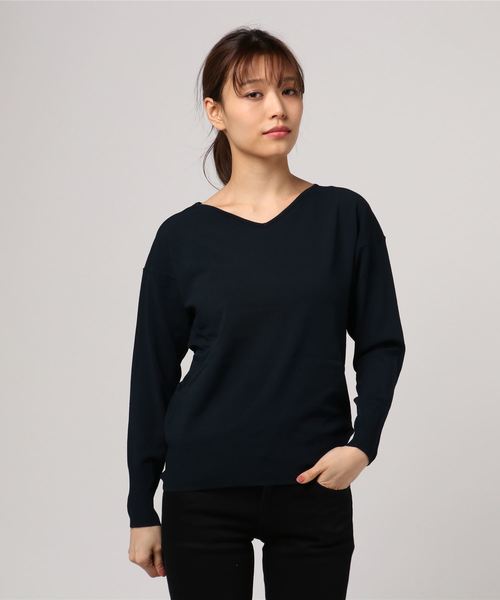ベーシックでコンパクトなVネックニット。浅めのVネックなのでオフィススタイリングにもおすすめ。バックのメタルプレートが控えめながらもワンポイントに。ボトムスを選ばないので様々なスタイリングが楽しめるアイテムです。
