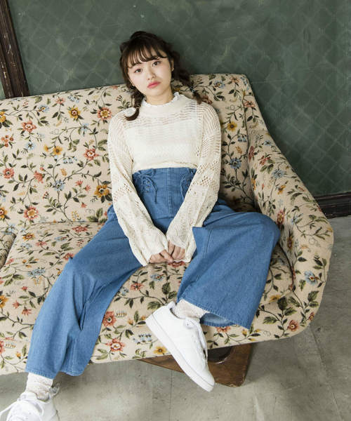 OLIVE des OLIVE 2018SS様々な模様の透かし編みが可愛いニットプルオーバー。ボリューミーなフレアスリーブが、さらにトレンド感をアップして存在感のある仕上がりに♪チェック柄のシャツを重ねたり、合わせるインナー次第で幅広いアレンジが楽しめます。
