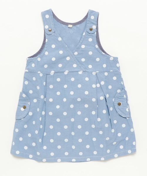 カシュクールデザインが大人っぽいジャンパースカート。ナチュラルなドット柄とシャープなストライプ柄の2柄展開。両サイドのポケットもアクセントになっています。インナーを変えたりカーデを羽織れば春先から秋口まで着れるのもうれしいポイントです。同素材でスカートやハットもありペアコーデもお楽しみいただけます。
