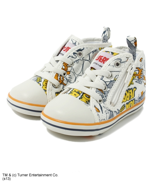 「トム&ジェリー」とコラボレーションしたベビー オールスター。アッパー柄の他、キャラクターモチーフを随所に落とし込んだキャッチーなデザイン。右足インソールには、ネコの"トム" 左足インソールには、ネズミの"ジェリー"のイラスト入り。ファミリーペアモデル。