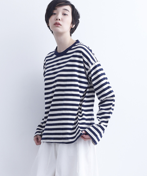 【MERLOT IKYU(メルローイキュウ)】merlotのトラッドライン。日々の喧騒から離れて一休みできるユーモア&ハッピーな「のんびり着」を提案。シンプルでどことなく遊びごころ溢れるシルエット、贅沢な生地使いでゆったりとした着ごこちにこだわった、ナチュラルにもモードにも着こなせる大人の「のんびり着」。どなたにでもちょっぴり個性的で高品質な商品をお楽しみ頂けるmerlotが発信しているトラッドラインです。■長袖のボーダートップスは身幅、袖幅共にゆったりとした着心地なるよう仕上げています。コットン100%のやわらかい生地感です。ネックラインはリブで仕上げ、単色にすることで全体のアクセントとしてのワンポイントになっています。長めの袖が女性らしい可愛らしさを演出しています。