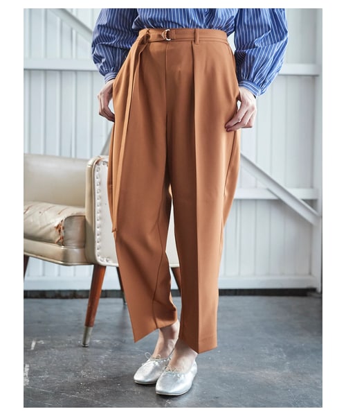 すっきりシルエットの、洗練レディなテーパードパンツ。 D釻ベルトでウエストマークし、スタイルアップも◎ バックはゴム仕様なのできちんと感がありながらも、リラックスした履き心地です。 ワードローブの定番としてぜひ押さえておきたい1枚は、トレンチコートなど春アウターとの相性も良く、デイリーユースの頻度も高まりそうなアイテムです。