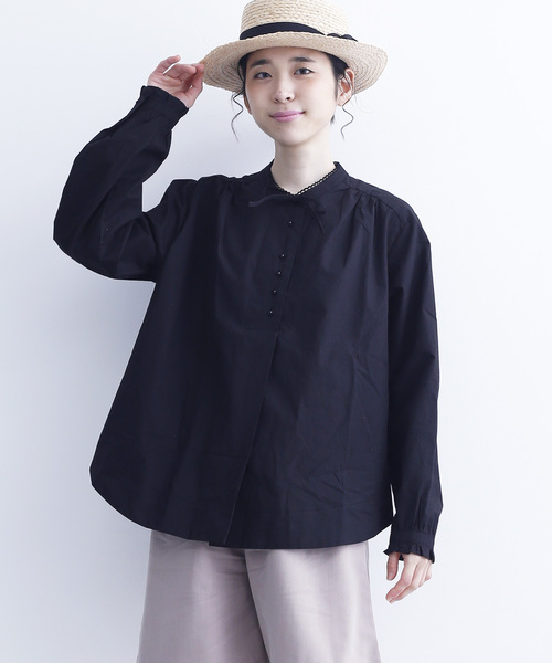 襟もとのリボンと小ぶりな6連ボタンがクラシカルで可愛いブラウス。後ろにはキュッとタックがよせられていて、後ろ姿も可愛く見せてくれます。 首回りに細やかなフリルがついていたりディティールにこだわったデザインです。 デニム×スニーカー合わせの甘辛MIXスタイルで旬な着こなしの完成です。