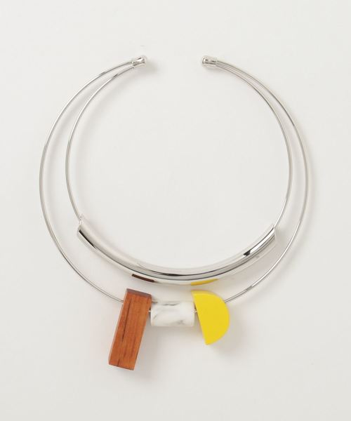 メタルと積木のようなカラーウッドがMIXになったネックレス。スタイリングのポイントにオススメなアイテム。
