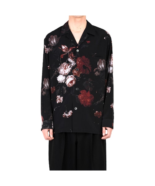 フラワー柄をプリントしたデシン素材を使用したパジャマシャツ。 ほどよいゆとりがあり、羽織やすいボックスシルエットのシャツです。 襟とカフスは薄い芯地を使用し軽く仕上げています。 ドレープ性の強い、薄手で柔らかいポリエステルのデシン素材です。 軽い肌触りと薄手ながら透けにくいのが特長です。 バラやカーネーションなどを描いた油絵の柄をインクジェットでプリントしています。