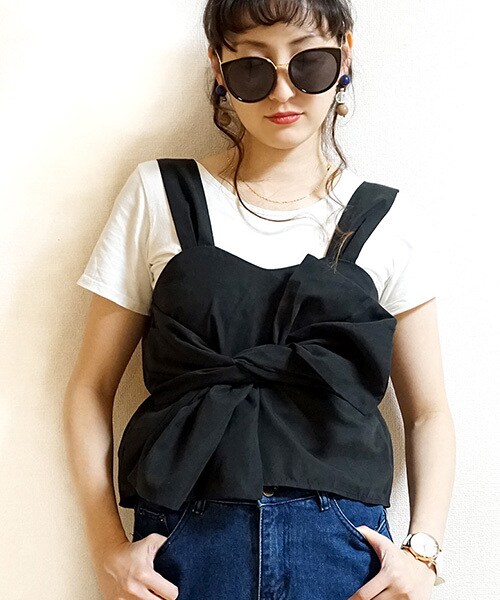 ほんのり光沢のあるピーチスキン素材で高見えします! トレンドのツヤ生地のガーリーなビスチェは、シンプルなTシャツやカットソーをぐんとオシャレに格上げしてくれる存在。