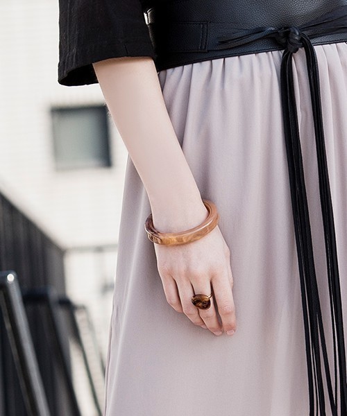 控えめなマーブル模様がさりげなくて合わせやすい。留め具が付いていないので手間なく付けられるのも嬉しいポイント。お好みのウッドやビーズ、シルバーなどのバングルやブレスレットと重ね付けして、個性的なアレンジをするのもオススメ。