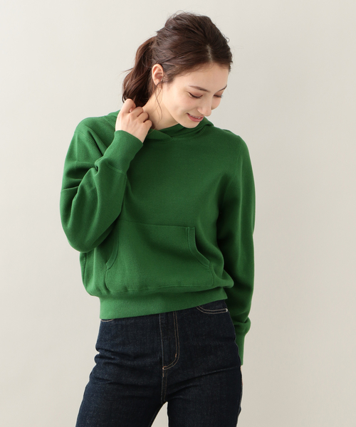 <ショート丈のニットパーカー>程良くゆとりのあるシルエットと、すっきりとしたニット編地が快適な着心地です。メンズライクなフーディーなので、カジュアルボトムと合わせたいアイテムです。ソフトで軽い綿混の糸を使用しています。モデル:165cm B:78cm W:60cm H:88cm 着用サイズ:2サイズ