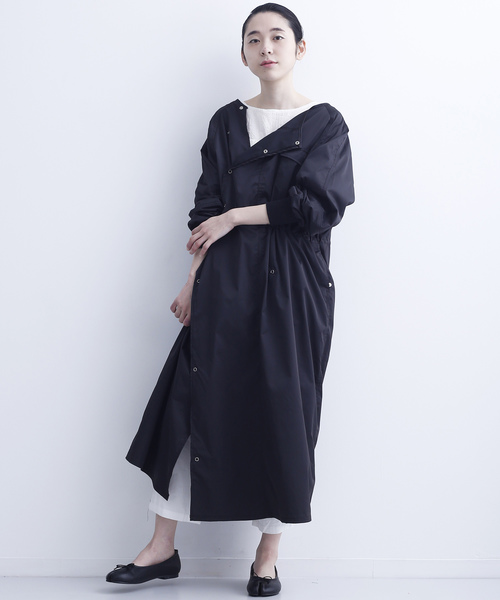 2018-SS NOSTALGIA キービジュアル着用商品 ノーカラーでオーバーサイズシルエットのスプリングコート。シャカシャカ素材と風合いがカジュアルな印象です。 ドロップショルダーなのが今っぽいシルエットに着こなせます。 カウエストのドロストをキュッと絞れば女性らしいシルエットへ。 一枚はもっておきたいアイテムです。