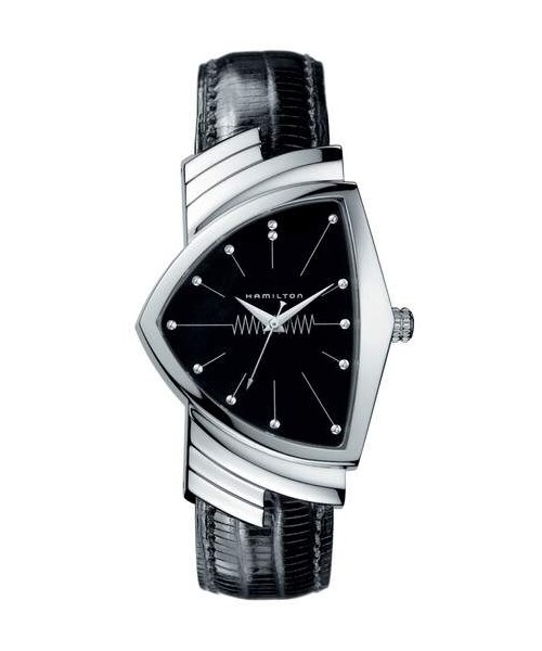 A tribute to the original 1957 Ventura that made history as the first electrical, battery-operated watch, the contemporary version mirrors the retro design aesthetic with atomic-inspired detailing at the futuristic dial. Style Name:Hamilton Ventura Leather Strap Watch, 32Mm X 50Mm. Style Number: 5446775_1. Available in stores.