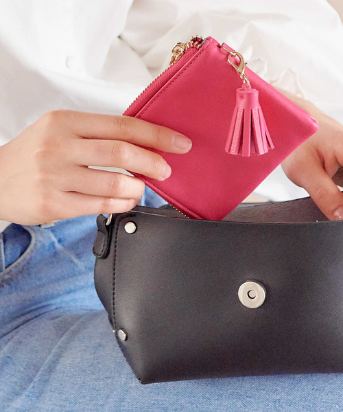 どんなバッグにも入るスリムな薄型ミニウォレット。【素材・サイズ感】L字ファスナーで開閉。コンパクトな形状ながら、小銭、カード数枚、お札を1つに収めることのできる使いやすい形状です。ややマットな合皮素材は柔らかく手に馴染み、大人っぽく持てます。取り外し可能なタッセルチャームがワンポイント!【スタイリング】手のひらサイズの薄型財布で、デイリー使いはもちろん、トレンドのミニバッグにもぴったり。荷物を減らしたいイベント時などにもオススメです。