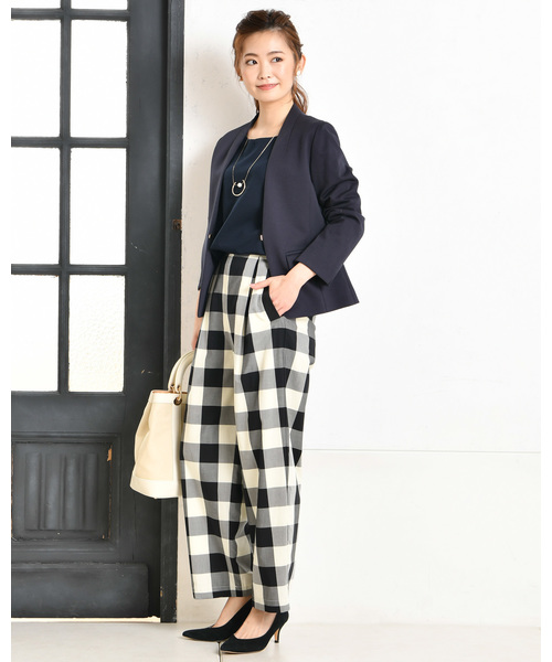 大きなチェック柄が目を引くワイドパンツです。太めのウエスト切り替えは、ベルトをしなくてもウエストマークしたようなスタイルアップ効果を与えます。後ろはゴムでぴったりフィットし、快適な着心地。コンパクトな丈はもちろん、ロング丈のトップスとの相性も抜群です。シンプルなトップスをインするコーディネートもおすすめ。・ファスナー有り。・裏地有り。
