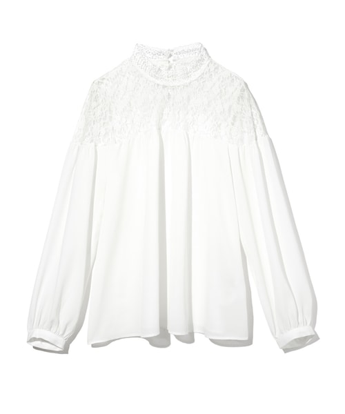 デコルテを花柄のチュールレースで切替え、フェミニンな雰囲気の漂うブラウス。 軽やかなシフォンジョーゼットを使い、柔らかく優しい印象に。 ボリュームを持たせたスリーブも、女性らしさをアピール。 ★チュール部分は裁断の関係で、柄の出方が写真と多少異なる場合があります。
