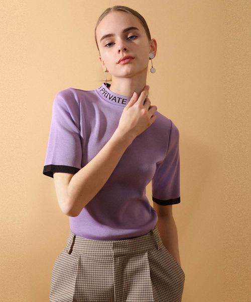 ■ベッキーコラボレーション”大人になった今だからこそ着たい、PRIVATEを楽しむためのアイテム”■ アイキャッチーな首まわりのロゴがポイントのニット。 Tシャツ感覚で着られる、ニットTは着回し力の高さが嬉しいところ。 丈感もジャストに設定しており、ボトムを選ばずに着用いただけます。 襟ぐりのロゴは顔周りを華やかに見せ、配色が引き締め効果もあるので華奢見え効果も絶大です。 1枚でぐっとトレンド感が高まるデザインで、今シーズンぜひ取り入れたい1枚です。 【Fabric】 生地には天然繊維の柔らかさと、合成繊維の機能を併せ持つ、アセテートポリエステル混紡素材を使用。 高級感のある程よい光沢とソフトな風合いが特徴です。 優れた吸汗性・吸湿性を持ち、着心地の良い、柔らかなタッチと見た目にも美しいドレープ感が嬉しい。 さらっとした着心地で夏場も着用いただける清涼感を実現した1枚です。 洗濯:手洗い可