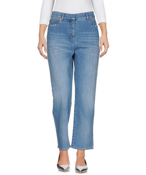 VALENTINO Jeans. denim, faded, studs, logo, solid color, light wash, mid rise, front closure, hook-and-bar, zip, multipockets, stretch, comfort fit, large sized. 98% Cotton, 2% Elastane