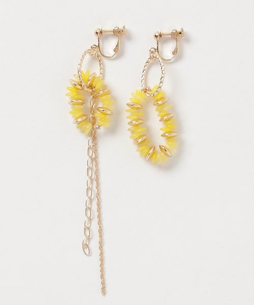 左右で異なるビーズパーツのアシメイヤリング。小さなビーズを繋げて仕上げたリングパーツが印象的で、どこかリゾート感漂うデザインです。顔回りをすっきりと魅せてくれる縦長シルエットと、耳元で揺れる大き目リングを組み合わせたアシメデザインが、今季らしくトレンド顔を作ってくれます。