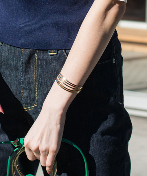 手元に存在感を放つ5連バングルです。 広がり方が美しく扇をイメージさせるデザインは、インパクトのあるサイズ感で手元を華奢に見せてくれます。 流れるようなメタルラインの煌めきが上品な印象に。 シンプルながら一点加えるだけでコーディネートの主役になる魅力的なアイテムです。
