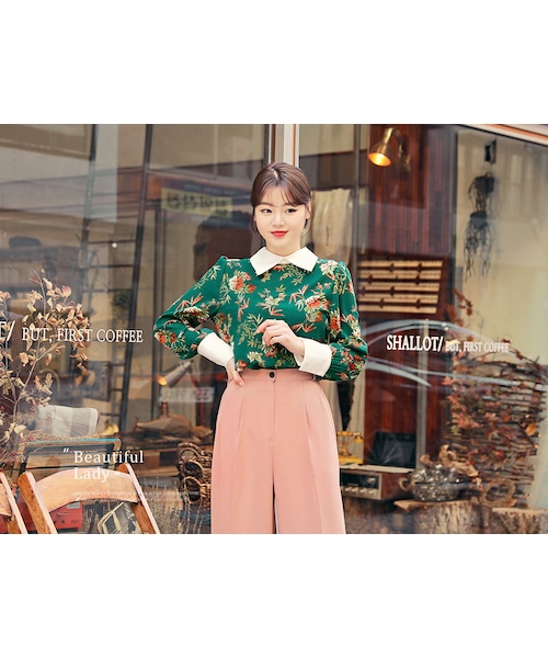 フェミニンな雰囲気溢れるフラワーパターンのブラウスです。ホワイトカラーとカフスで高級感を与えました。目を引くパターンでフェイストーンをパッと明るく見せます◎デイリーなブラックカラーと、上品なグリーンカラーの2色展開です♪バックボタンで脱ぎ着可能!華やかなパターンで体型カバーも叶えます♡