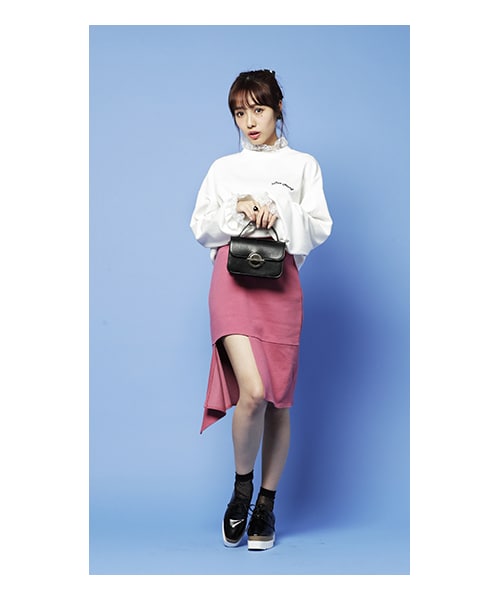 アシンメトリーにカットされたスカートは、あざといチラ見せの上級者♪ スクエア型のオープン加工は、足長効果抜群のアイテムです。 ブラウスからTシャツ、スウェットまで、合わせやすいアイテムです。