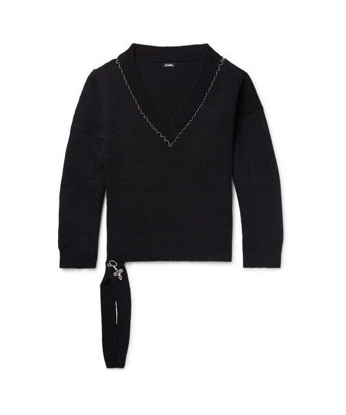 Inspired by punk rock and rebellious subcultures, Mr Raf Simons always designs with an edge. This oversized sweater has been knitted in Italy from pure new wool, and is detailed with a deep V-neck finished with contrasting white stitching and a cool deconstructed hem attached to a chunky clasp. Wear yours with black jeans and box-fresh sneakers. Shown here with Vetements jeans, Rick Owens T-shirt, Maison Margiela sneakers, Givenchy socks. - - Black wool - V-neck, white stitching, burnished silver clasp-detailed hem, leather and ribbed trims - 100% pure new wool - Dry clean - Made in Italy
