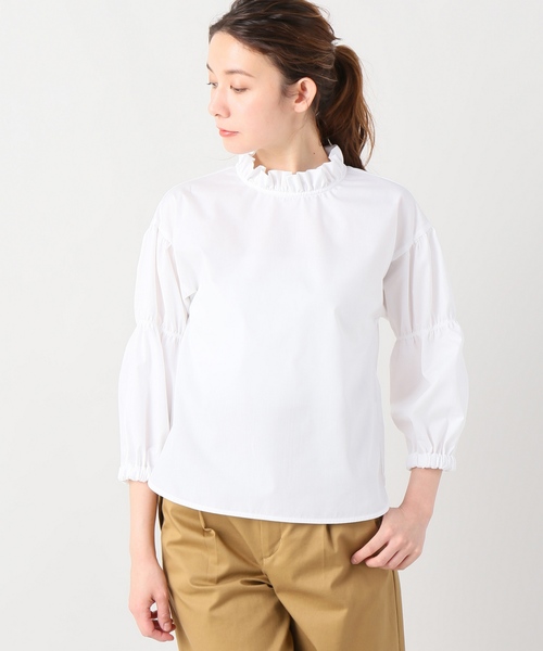 トレンドのハイネックブラウスです。 透けにくい素材なので、長い季節で着用できる一枚です。春にはスカートやワイドパンツに合わせるだけでお洒落度が増すアイテムです。